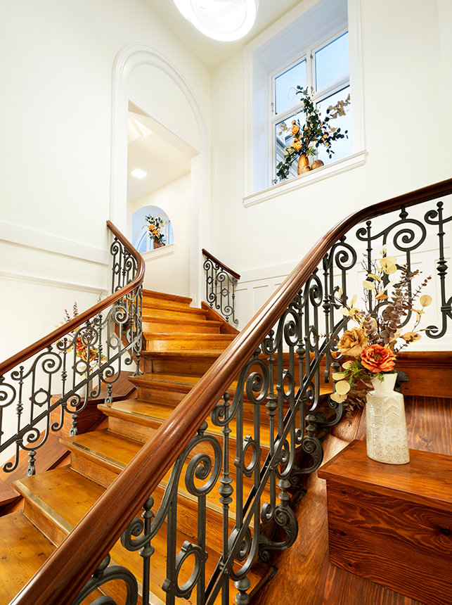 En el sexto piso por encima de la Recepción está el impresionante gran atrio del edificio. El diseño fue inspirado en la secuoya, incluyendo la escalera circular con un intrincado patrón de hojas.